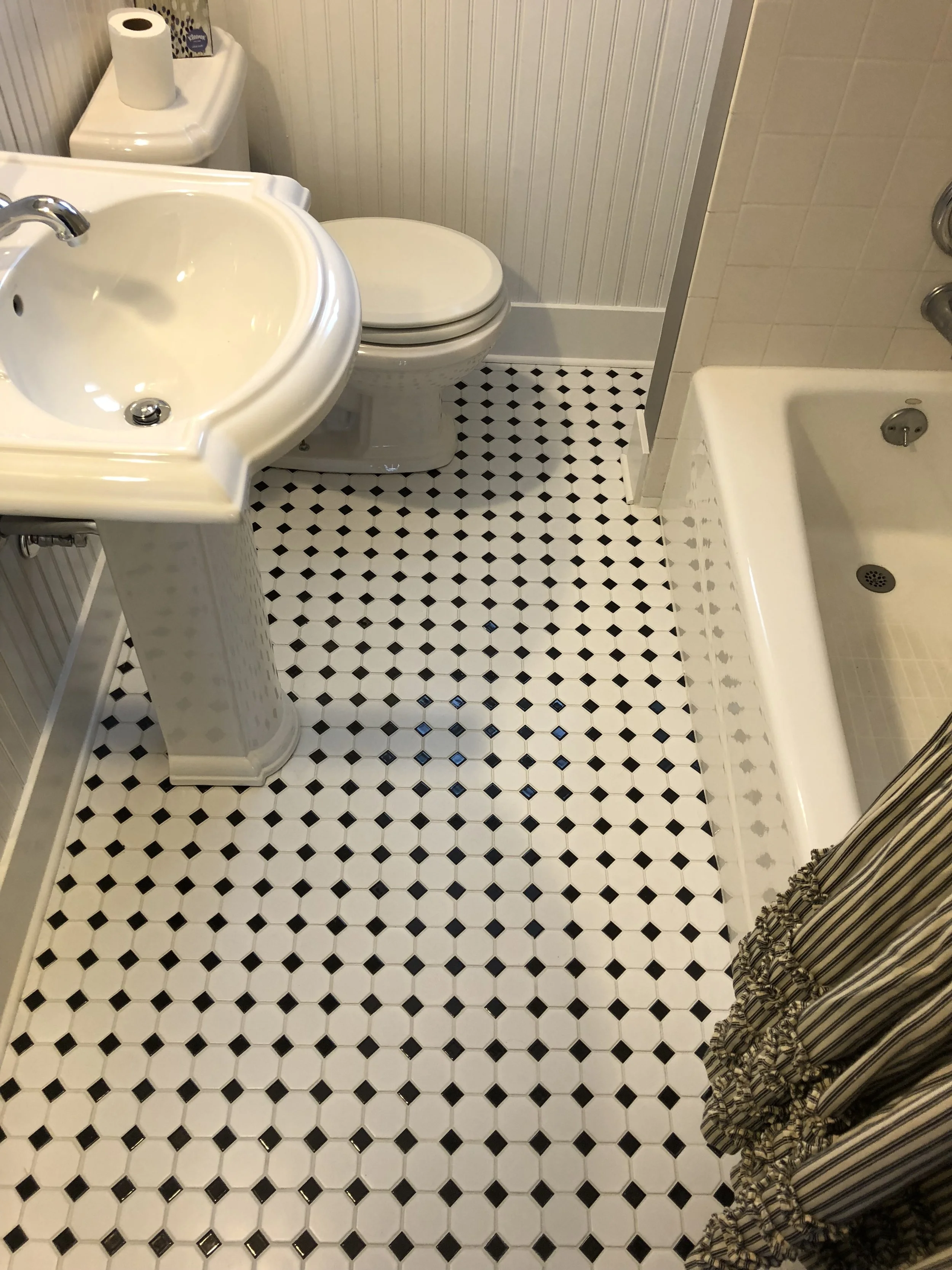Bathroom Project , Buffalo NY. Bead board and baseboard moldings, ceramic floor, and new pedestal sink.